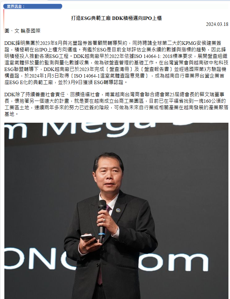 ESG (E: Môi trường, S: Xã hội, G: Quản trị) hiện là xu hướng số liệu và chỉ số toàn cầu để đánh giá sự bền vững của doanh nghiệp. Hiện tại, từ các quy định của chính phủ quốc tế, các rào cản khu vực (ví dụ: Cơ chế điều chỉnh biên giới carbon CBAM) và yêu cầu của các thương hiệu lớn đối với chuỗi cung ứng (ví dụ: đạt được kiểm kê carbon ISO-14064-1, chứng nhận dấu chân carbon ISO14067)... đều đang lần lượt áp dụng các biện pháp bắt buộc để quy định; trong kỷ nguyên di dời chuỗi cung ứng toàn cầu hậu đại dịch, các doanh nhân Đài Loan ở Đông Nam Á là những người chịu ảnh hưởng đầu tiên! Ngày 12 tháng 12 năm 2023, Viện Công nghiệp Thông tin, Hiệp hội Liên minh Công nghệ Trung hòa Carbon ESG và Tập đoàn DDK Feng Ming đã hợp tác tổ chức lễ ra mắt "Địa điểm Minh họa Liên minh ESG Doanh nhân Đài Loan tại Việt Nam"; lễ tuyên thệ do Phó Viện trưởng Viện Giáo dục Kỹ thuật số của Viện Công nghiệp Thông tin Ye Zonghan, Chủ tịch Tập đoàn Feng Ming Cai Wenrui, và Cố vấn Hiệp hội Liên minh Công nghệ Trung hòa Carbon ESG Zhang Kunren đại diện, và ngay sau buổi lễ, Công ty TNHH Xác minh Quốc tế Aris đã thực hiện dự án tư vấn, sử dụng "Nền tảng Quản lý Carbon Dingxin" để lập báo cáo kiểm kê khí nhà kính, trở thành mô hình địa điểm minh họa Liên minh ESG Doanh nhân Đài Loan đầu tiên tại Việt Nam. Phó Viện trưởng Viện Giáo dục Kỹ thuật số của Viện Công nghiệp Thông tin Ye Zonghan phát biểu: "Viện Công nghiệp Thông tin hợp tác chặt chẽ với Hiệp hội Liên minh Công nghệ Trung hòa Carbon ESG, thúc đẩy chứng nhận hộ chiếu đào tạo nhân tài ESG, không chỉ có kiến thức lý thuyết mà còn có khả năng thực chiến, giúp doanh nhân Đài Loan đạt được mục tiêu tiết kiệm năng lượng, đồng thời thúc đẩy trung hòa carbon và phát triển bền vững." DDK_ESG_NEWS02.png Chủ tịch Tập đoàn Feng Ming Cai Wenrui phát biểu: "ESG là việc không thể chậm trễ! Hiện tại các doanh nghiệp vẫn đang trong giai đoạn quan sát hoặc tìm hiểu về các chứng nhận quốc tế, Tập đoàn Feng Ming với tư cách là thương hiệu hàng đầu về sản xuất yên xe đạp, hưởng ứng ESG, Feng Ming là người dẫn đầu phá gió, muốn làm tiên phong mở đường cho doanh nhân Đài Loan, trở thành địa điểm minh họa mẫu cho chứng nhận ESG, để nhiều doanh nghiệp hơn có dấu vết để noi theo và cùng nhau thực hiện." Phó Chủ tịch Bộ phận Kinh doanh Đông Nam Á của Dingxin Computer Zheng Jialin cho biết: "Dingxin Computer nỗ lực hết mình hỗ trợ doanh nhân Đài Loan tại Đông Nam Á ứng phó với ESG, dẫn dắt doanh nghiệp hướng tới chuyển đổi kép Số hóa X ESG", trên nền tảng dịch vụ thông tin hỗ trợ doanh nghiệp ứng dụng cơ sở hạ tầng thông tin, tìm ra lộ trình thực hành sản xuất xanh tốt nhất; hiện tại cũng tham gia vào vị trí hội viên cốt lõi của Liên minh Công nghệ Trung hòa Carbon ESG, ra mắt Đánh giá năng lực thực thi quản lý khí thải carbon của doanh nghiệp Đài Loan ESG và giải pháp Nền tảng Quản lý Carbon Dingxin; Chi nhánh Dingxin Computer tại Việt Nam (Phần mềm Dingjie Việt Nam) tích cực hợp tác với các đối tác chiến lược, dự án ESG của Tập đoàn DDK Feng Ming lần này là sự kết hợp mạnh mẽ với Chứng nhận Quốc tế Aris, cùng nhau đưa vào "Nền tảng Quản lý Carbon Dingxin" để thu thập dữ liệu, giúp doanh nghiệp chỉ cần một cú nhấp chuột là có thể tạo ra báo cáo kiểm kê khí nhà kính.