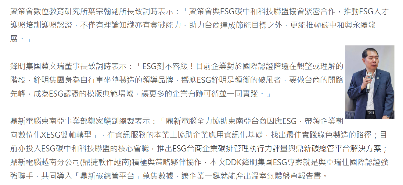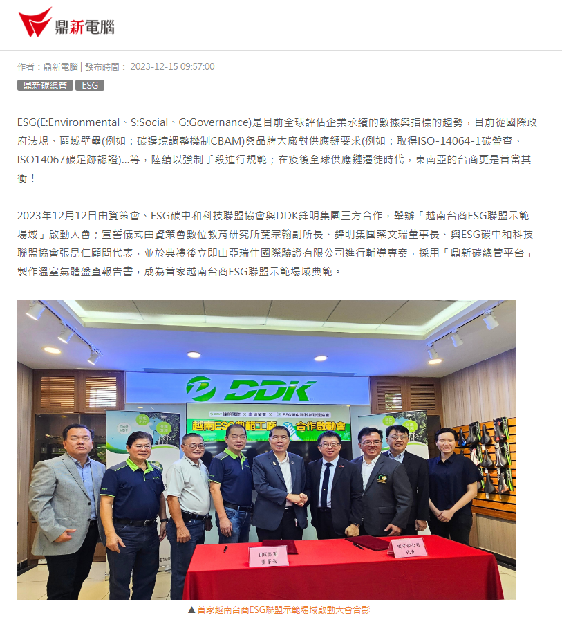 ESG (E: Môi trường, S: Xã hội, G: Quản trị) hiện là xu hướng số liệu và chỉ số toàn cầu để đánh giá sự bền vững của doanh nghiệp. Hiện tại, từ các quy định của chính phủ quốc tế, các rào cản khu vực (ví dụ: Cơ chế điều chỉnh biên giới carbon CBAM) và yêu cầu của các thương hiệu lớn đối với chuỗi cung ứng (ví dụ: đạt được kiểm kê carbon ISO-14064-1, chứng nhận dấu chân carbon ISO14067)... đều đang lần lượt áp dụng các biện pháp bắt buộc để quy định; trong kỷ nguyên di dời chuỗi cung ứng toàn cầu hậu đại dịch, các doanh nhân Đài Loan ở Đông Nam Á là những người chịu ảnh hưởng đầu tiên! Ngày 12 tháng 12 năm 2023, Viện Công nghiệp Thông tin, Hiệp hội Liên minh Công nghệ Trung hòa Carbon ESG và Tập đoàn DDK Feng Ming đã hợp tác tổ chức lễ ra mắt "Địa điểm Minh họa Liên minh ESG Doanh nhân Đài Loan tại Việt Nam"; lễ tuyên thệ do Phó Viện trưởng Viện Giáo dục Kỹ thuật số của Viện Công nghiệp Thông tin Ye Zonghan, Chủ tịch Tập đoàn Feng Ming Cai Wenrui, và Cố vấn Hiệp hội Liên minh Công nghệ Trung hòa Carbon ESG Zhang Kunren đại diện, và ngay sau buổi lễ, Công ty TNHH Xác minh Quốc tế Aris đã thực hiện dự án tư vấn, sử dụng "Nền tảng Quản lý Carbon Dingxin" để lập báo cáo kiểm kê khí nhà kính, trở thành mô hình địa điểm minh họa Liên minh ESG Doanh nhân Đài Loan đầu tiên tại Việt Nam. https://www.digiwin.com/tw/news/3500.html
